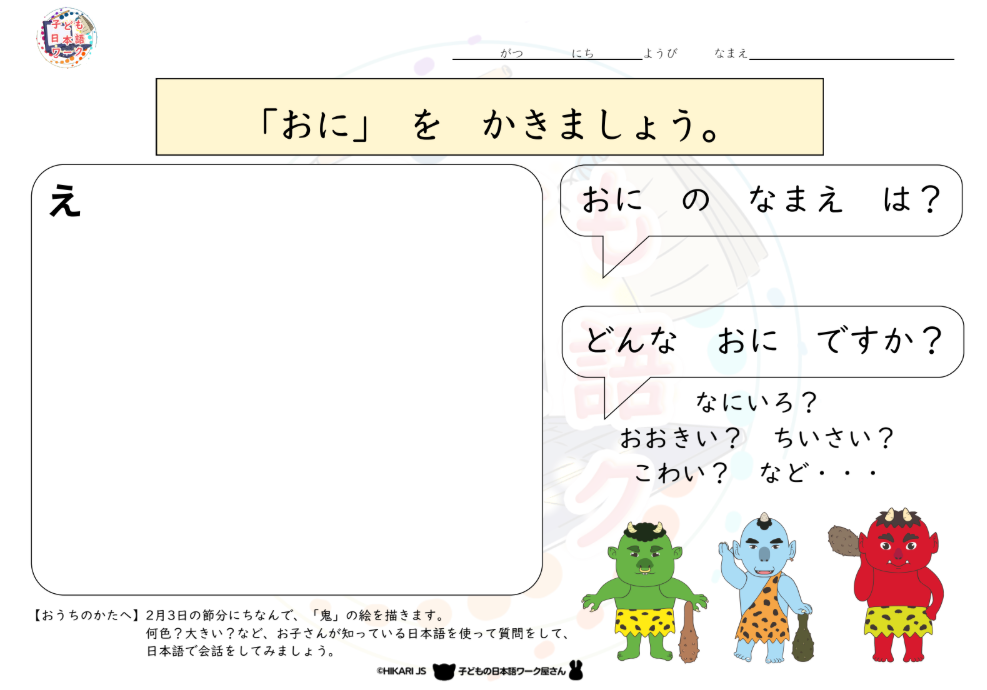 レベル 超入門(文字なし)入門(ひらがな)初級(カタカナ)初中級(小1漢字)中級(小2漢字)上級 ジャンル 数字(数え方)わくわく1めいろワードサーチ会話トピック/自己紹介一時帰国ロールプレイングカレンダー写真描写神経衰弱カードロールプレイングひらがなカタカナ漢字ゲームもぐらたたきバルーンゲームクイズプリント数字(時計/曜日/日付)文章読解短い作文長い作文(縦&横書き)季節・行事間違い探し動画 会員限定 上級 会員限定 クイズ 漢字 形容詞のことば「○い」 #ことば#漢字 初級(カタカナ) カタカナ サシスセソ [カタカナ書き順 動画] #カタカナ#ことば#動画 上級 ゲーム みらひか間違い探し 2026年1月② #ゲーム#プリント#間違い探し 上級 文章読解 音読教材絵本「ブレーメンの音楽たい」【中級レベル・ルビあり】 #2年生の漢字#絵本 上級 文章読解 音読教材絵本「ブレーメンの音楽たい」【中級レベル】 #2年生の漢字#絵本 初級(カタカナ) カタカナ 音読教材絵本「ブレーメンのおんがくたい」【入門レベル】 #カタカナ#ひらがな#絵本 入門(ひらがな) ひらがな 音読教材絵本「ブレーメンのおんがくたい」【入門レベル・ルビあり】 #ひらがな#絵本 入門(ひらがな) 季節・行事 あなたの「おに」をかきましょう② #年中行事#日本文化 上級 季節・行事 作文「あなたが退治したい『鬼』は何ですか。」 #作文#年中行事 入門(ひらがな) プリント あなたの「おに」をかきましょう① #年中行事#日本文化 入門(ひらがな) カレンダー 【1月~3月】みらひかカレンダー2026年 #カレンダー#ひらがな 上級 長い作文(縦&横書き) 作文「最近 気になっているニュースについて書きましょう」 #作文 入門(ひらがな) クイズ 【ドリル】絵×ひらがな 点つなぎ きゃきゅきょ #クイズ#クイズゲーム#ゲーム#ひらがな 入門(ひらがな) ひらがな ぴゃ・ぴゅ・ぴょ [ひらがな書き順 動画] #ひらがな#動画 入門(ひらがな) ひらがな びゃ・びゅ・びょ [ひらがな書き順 動画] #ひらがな#動画 上級 プリント みらひか間違い探し 2026年1月① #ゲーム#プリント#間違い探し 入門(ひらがな) クイズ 【ドリル】これは何の字? きゃきゅきょ #クイズ#クイズゲーム#ゲーム#ひらがな 入門(ひらがな) ひらがな じゃ・じゅ・じょ [ひらがな書き順 動画] #ひらがな#動画 入門(ひらがな) ゲーム ひらがな 「きゃ・きゅ・きょ」のことば マッチング #ことば#ひらがな#マッチングゲーム 入門(ひらがな) ひらがな ぎゃ・ぎゅ・ぎょ [ひらがな書き順 動画] #ひらがな#動画 上級 長い作文(縦&横書き) 作文「今年の目標を書きましょう」 #作文 上級 長い作文(縦&横書き) 作文「クリスマスプレゼントは何がほしいですか。」 #作文#行事 入門(ひらがな) 数字(数え方) 【助数詞 】ひとり~じゅうにん フラッシュカード #かぞえかた#ことば#ひらがな#フラッシュカード 初中級(小1漢字) 数字(数え方) 【助数詞 】1人~10人 フラッシュカード #ことば#フラッシュカード#数え方 超入門(文字なし) ゲーム 聞き取りクイズ「いろ」 #聞き取り#色 上級 プリント みらひか間違い探し 2025年12月② #ゲーム#プリント#間違い探し 初級(カタカナ) カタカナ 【ドリル】絵×カタカナ ルーレット 「カキクケコ」 #カタカナ#クイズ#クイズゲーム#ゲーム 上級 季節・行事 作文「あなたの国ではクリスマスは どのように過ごしますか」 #作文#行事 初級(カタカナ) カタカナ カキクケコ [カタカナ書き順 動画] #カタカナ#ことば#動画 会員限定 初級(カタカナ) 会員限定 カタカナ カタカナ 冬の言葉 神経衰弱 #カタカナ#ことば#神経衰弱 中級(小2漢字) ゲーム 漢字 冬にまつわる言葉 #ことば#日本文化#漢字 会員限定 初級(カタカナ) 会員限定 カタカナ カタカナ清音 食べ物 #カタカナ#ゲーム#食べ物 上級 プリント 年賀状を書いてみよう!2026 #年中行事#日本文化#行事 初級(カタカナ) カタカナ カタカナ ア行のことば マッチング #カタカナ#ゲーム#マッチングゲーム 上級 漢字 作文「今年いちばん( )ことは何ですか。」 #作文 初級(カタカナ) カタカナ アイウエオ [カタカナ書き順 動画] #カタカナ#ことば 会員限定 上級 会員限定 ゲーム みらひか間違い探し 12月①【2025】 #ゲーム#プリント#間違い探し 入門(ひらがな) クイズ ちいさい「っ」 #クイズ#クイズゲーム#ゲーム#ひらがな 上級 季節・行事 みらひか間違い探し 11月【2025】 #ことば#作文#日本文化#語彙#間違い探し 入門(ひらがな) クイズ 【ドリル】絵×ひらがな 神経衰弱 ぱぴぷぺぽ #クイズ#クイズゲーム#ゲーム#ひらがな 入門(ひらがな) クイズ 【ドリル】絵×ひらがな 点つなぎ ぱぴぷぺぽ #クイズ#クイズゲーム#ゲーム#ひらがな 入門(ひらがな) クイズ 【ドリル】絵×ひらがな オープンボックス ぱぴぷぺぽ #クイズ#クイズゲーム#ゲーム#ひらがな 入門(ひらがな) クイズ 【ドリル】絵×ひらがな マッチアップ ぱぴぷぺぽ #クイズ#クイズゲーム#ゲーム#ひらがな 入門(ひらがな) クイズ 【ドリル】絵×ひらがな ルーレット ぱぴぷぺぽ #クイズ#クイズゲーム#ゲーム#ひらがな 入門(ひらがな) クイズ 【ドリル】