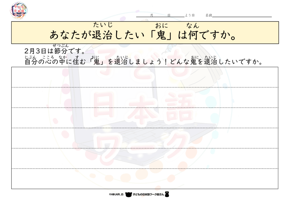 レベル 超入門(文字なし)入門(ひらがな)初級(カタカナ)初中級(小1漢字)中級(小2漢字)上級 ジャンル 数字(数え方)わくわく1めいろワードサーチ会話トピック/自己紹介一時帰国ロールプレイングカレンダー写真描写神経衰弱カードロールプレイングひらがなカタカナ漢字ゲームもぐらたたきバルーンゲームクイズプリント数字(時計/曜日/日付)文章読解短い作文長い作文(縦&横書き)季節・行事間違い探し動画 上級 季節・行事 作文「あなたが退治したい『鬼』は何ですか。」 #作文#年中行事 上級 長い作文(縦&横書き) 作文「最近 気になっているニュースについて書きましょう」 #作文 入門(ひらがな) クイズ 【ドリル】絵×ひらがな 点つなぎ きゃきゅきょ #クイズ#クイズゲーム#ゲーム#ひらがな 入門(ひらがな) クイズ 【ドリル】これは何の字? きゃきゅきょ #クイズ#クイズゲーム#ゲーム#ひらがな 上級 長い作文(縦&横書き) 作文「今年の目標を書きましょう」 #作文 上級 長い作文(縦&横書き) 作文「クリスマスプレゼントは何がほしいですか。」 #作文#行事 初級(カタカナ) カタカナ 【ドリル】絵×カタカナ ルーレット 「カキクケコ」 #カタカナ#クイズ#クイズゲーム#ゲーム 上級 季節・行事 作文「あなたの国ではクリスマスは どのように過ごしますか」 #作文#行事 初級(カタカナ) カタカナ カキクケコ [カタカナ書き順 動画] #カタカナ#ことば 初級(カタカナ) カタカナ カタカナ 冬の言葉 神経衰弱 #カタカナ#ことば#神経衰弱 初級(カタカナ) カタカナ カタカナ清音 食べ物 #カタカナ#ゲーム#食べ物 初級(カタカナ) カタカナ カタカナ ア行のことば マッチング #カタカナ#ゲーム#マッチングゲーム 上級 漢字 作文「今年いちばん( )ことは何ですか。」 #作文 初級(カタカナ) カタカナ アイウエオ [カタカナ書き順 動画] #カタカナ#ことば 入門(ひらがな) クイズ ちいさい「っ」 #クイズ#クイズゲーム#ゲーム#ひらがな 上級 季節・行事 みらひか間違い探し 11月【2025】 #ことば#作文#日本文化#語彙#間違い探し 入門(ひらがな) クイズ 【ドリル】絵×ひらがな 神経衰弱 ぱぴぷぺぽ #クイズ#クイズゲーム#ゲーム#ひらがな 入門(ひらがな) クイズ 【ドリル】絵×ひらがな 点つなぎ ぱぴぷぺぽ #クイズ#クイズゲーム#ゲーム#ひらがな 入門(ひらがな) クイズ 【ドリル】絵×ひらがな オープンボックス ぱぴぷぺぽ #クイズ#クイズゲーム#ゲーム#ひらがな 入門(ひらがな) クイズ 【ドリル】絵×ひらがな マッチアップ ぱぴぷぺぽ #クイズ#クイズゲーム#ゲーム#ひらがな 入門(ひらがな) クイズ 【ドリル】絵×ひらがな ルーレット ぱぴぷぺぽ #クイズ#クイズゲーム#ゲーム#ひらがな 入門(ひらがな) クイズ 【ドリル】これは何の字? ぱぴぷぺぽ #クイズ#クイズゲーム#ゲーム#ひらがな 入門(ひらがな) クイズ 【ドリル】絵×ひらがな 点つなぎ ばびぶべぼ #クイズ#クイズゲーム#ゲーム#ひらがな 入門(ひらがな) クイズ 【ドリル】絵×ひらがな オープンボックス ばびぶべぼ #クイズ#クイズゲーム#ゲーム#ひらがな 入門(ひらがな) クイズ 【ドリル】絵×ひらがな マッチアップ ばびぶべぼ #クイズ#クイズゲーム#ゲーム#ひらがな 入門(ひらがな) クイズ 【ドリル】絵×ひらがな ルーレット ばびぶべぼ #クイズ#クイズゲーム#ゲーム#ひらがな 入門(ひらがな) クイズ 【ドリル】これは何の字?ばびぶべぼ #クイズ#クイズゲーム#ゲーム#ひらがな 入門(ひらがな) クイズ 【ドリル】絵×ひらがな 神経衰弱 だぢづでど #クイズ#クイズゲーム#ゲーム#ひらがな 入門(ひらがな) クイズ 【ドリル】絵×ひらがな 点つなぎ だぢづでど #クイズ#クイズゲーム#ゲーム#ひらがな 入門(ひらがな) クイズ 【ドリル】絵×ひらがな オープンボックス だぢづでど #クイズ#クイズゲーム#ゲーム#ひらがな 入門(ひらがな) クイズ 【ドリル】絵×ひらがな マッチアップ だぢづでど #クイズ#クイズゲーム#ゲーム#ひらがな 入門(ひらがな) クイズ 【ドリル】絵×ひらがな ルーレット だぢづでど #クイズ#クイズゲーム#ゲーム#ひらがな 入門(ひらがな) クイズ 【ドリル】これはなんの字?だぢづでど #クイズ#ゲーム#ひらがな 入門(ひらがな) クイズ 【ドリル】絵×ひらがなルーレット ざじずぜぞ #クイズ#ゲーム#ひらがな 入門(ひらがな) クイズ 【ドリル】絵×ひらがなマッチアップ ざじずぜぞ #ゲーム#ひらがな#マッチングゲーム 入門(ひらがな) クイズ 【ドリル】点つなぎ がぎぐげご #クイズ#ゲーム#ことば#ひらがな 入門(ひらがな) クイズ 【ドリル】絵×ひらがな オープンボックス がぎぐげご #クイズ#ゲーム#ひらがな 入門(ひらがな) クイズ 【ドリル】絵×ひらがなルーレットがぎぐげご #クイズ#ゲーム#ひらがな 入門(ひらがな) クイズ 【ドリル】がぎぐげご これはなに? #クイズ#ゲーム#ことば#ひらがな 入門(ひらがな) クイズ わくわく1やさい② なんでしょうクイズ #わくわく1#野菜 入門(ひらがな) カード 絵カード 【きょうしつでつかうことば】 『わくわくⅠ』掲載 #単語カード#日本語#絵カード 上級 クイズ 水・液体のオノ