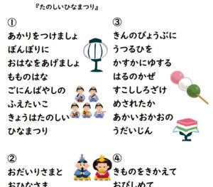 <blockquote class="wp-embedded-content" data-secret="h8Gf6mRphl"><a href="https://kyozai.hikari-js.co.jp/game/tanoshiihinamatsuri/">歌詞プリント「たのしいひなまつり」</a></blockquote><iframe sandbox="allow-scripts" security="restricted" src="https://kyozai.hikari-js.co.jp/game/tanoshiihinamatsuri/embed/#?secret=h8Gf6mRphl" width="600" height="400" title="“歌詞プリント「たのしいひなまつり」” — 子どもの日本語ワーク屋さん - 光JS" data-secret="h8Gf6mRphl" frameborder="0" marginwidth="0" marginheight="0" scrolling="no" class="wp-embedded-content"></iframe><script type="text/javascript"> /* <![CDATA[ */ /*! This file is auto-generated */ !function(d,l){"use strict";l.querySelector&&d.addEventListener&&"undefined"!=typeof URL&&(d.wp=d.wp||{},d.wp.receiveEmbedMessage||(d.wp.receiveEmbedMessage=function(e){var t=e.data;if((t||t.secret||t.message||t.value)&&!/[^a-zA-Z0-9]/.test(t.secret)){for(var s,r,n,a=l.querySelectorAll('iframe[data-secret="'+t.secret+'"]'),o=l.querySelectorAll('blockquote[data-secret="'+t.secret+'"]'),c=new RegExp("^https?:$","i"),i=0;i<o.length;i++)o[i].style.display="none";for(i=0;i<a.length;i++)s=a[i],e.source===s.contentWindow&&(s.removeAttribute("style"),"height"===t.message?(1e3<(r=parseInt(t.value,10))?r=1e3:~~r<200&&(r=200),s.height=r):"link"===t.message&&(r=new URL(s.getAttribute("src")),n=new URL(t.value),c.test(n.protocol))&&n.host===r.host&&l.activeElement===s&&(d.top.location.href=t.value))}},d.addEventListener("message",d.wp.receiveEmbedMessage,!1),l.addEventListener("DOMContentLoaded",function(){for(var e,t,s=l.querySelectorAll("iframe.wp-embedded-content"),r=0;r<s.length;r++)(t=(e=s[r]).getAttribute("data-secret"))||(t=Math.random().toString(36).substring(2,12),e.src+="#?secret="+t,e.setAttribute("data-secret",t)),e.contentWindow.postMessage({message:"ready",secret:t},"*")},!1)))}(window,document); /* ]]> */ </script>
